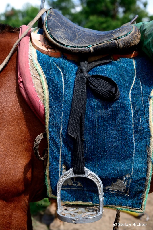 Russischer Sattel mit individuell verstellbaren Steigbügeln.