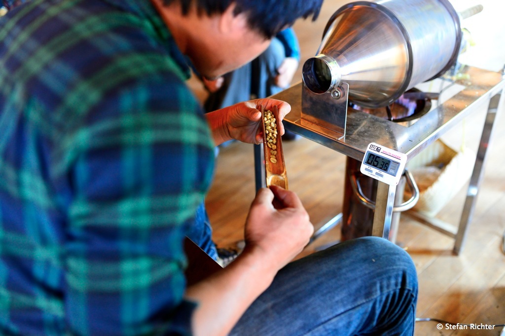Dann geht’s zur Röstung. In unserem Fall eine kleine Maschine, in der max. 1 kg Bohnen auf einmal geröstet werden kann. 2. Januar 2014 von julia13713