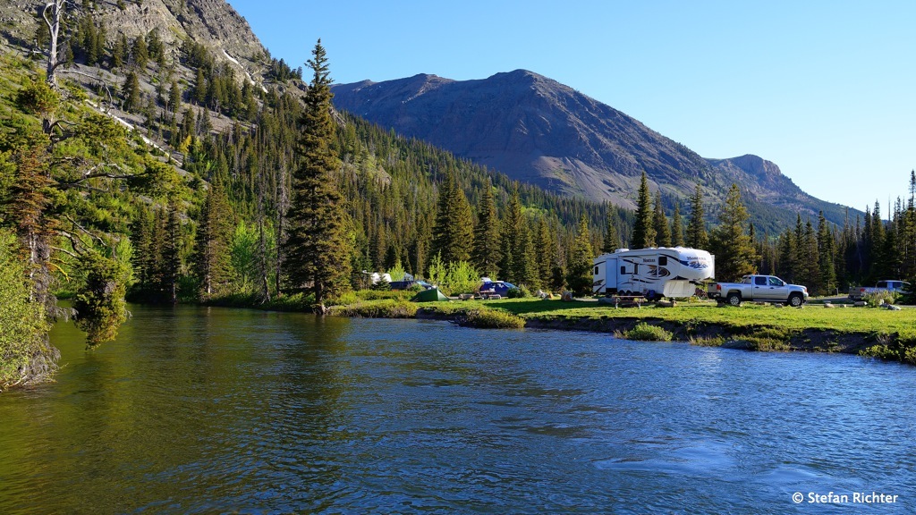Größenvergleich. In das typische amerikanische RV (Recreation Vehicle) rechts würde unser Zelt (der kleine grüne Punkt links) einige Male reinpassen. 29. Juni 2014 von julia13713