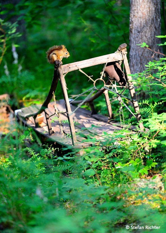 Auf einem alten Holzschlitten hat es sich ein Eichhörnchen gemütlich gemacht. 29. Juli 2014 von julia13713